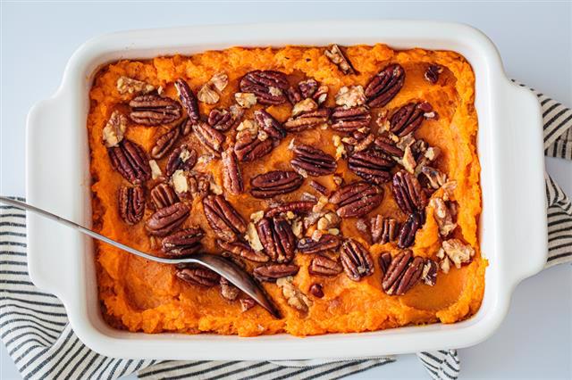 In medium bowl, mix the brown sugar and flour. Cut in the butter until the mixture is coarse. Stir in the pecans. Sprinkle the mixture over the sweet potato mixture.